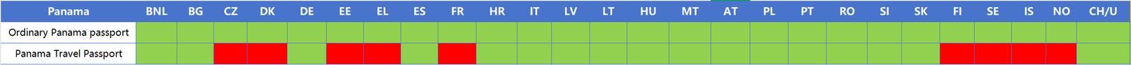 From the chart, we can see that Germany (DE) recognizes the Panama Travel Passport, but France (FR) does not. Therefore, if you wish to travel to the Schengen Area, you should use this passport to enter Europe through Germany, not France.